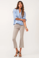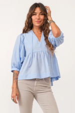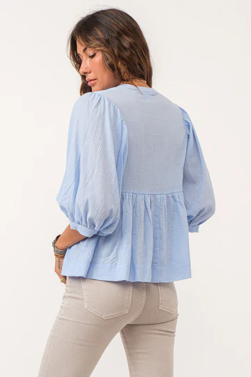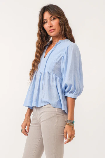 V-neck top with self tie & 3/4 sleeve finished in cotton gauze. Solid color woven on relaxed fit. Celebration of feminine refined, effortlessly showcasing hues of grace and allure in every stitch!
