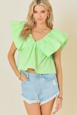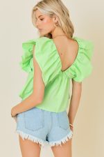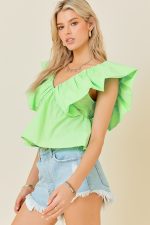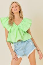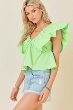 Open V-Neck Ruffle Sleeve Poplin Top