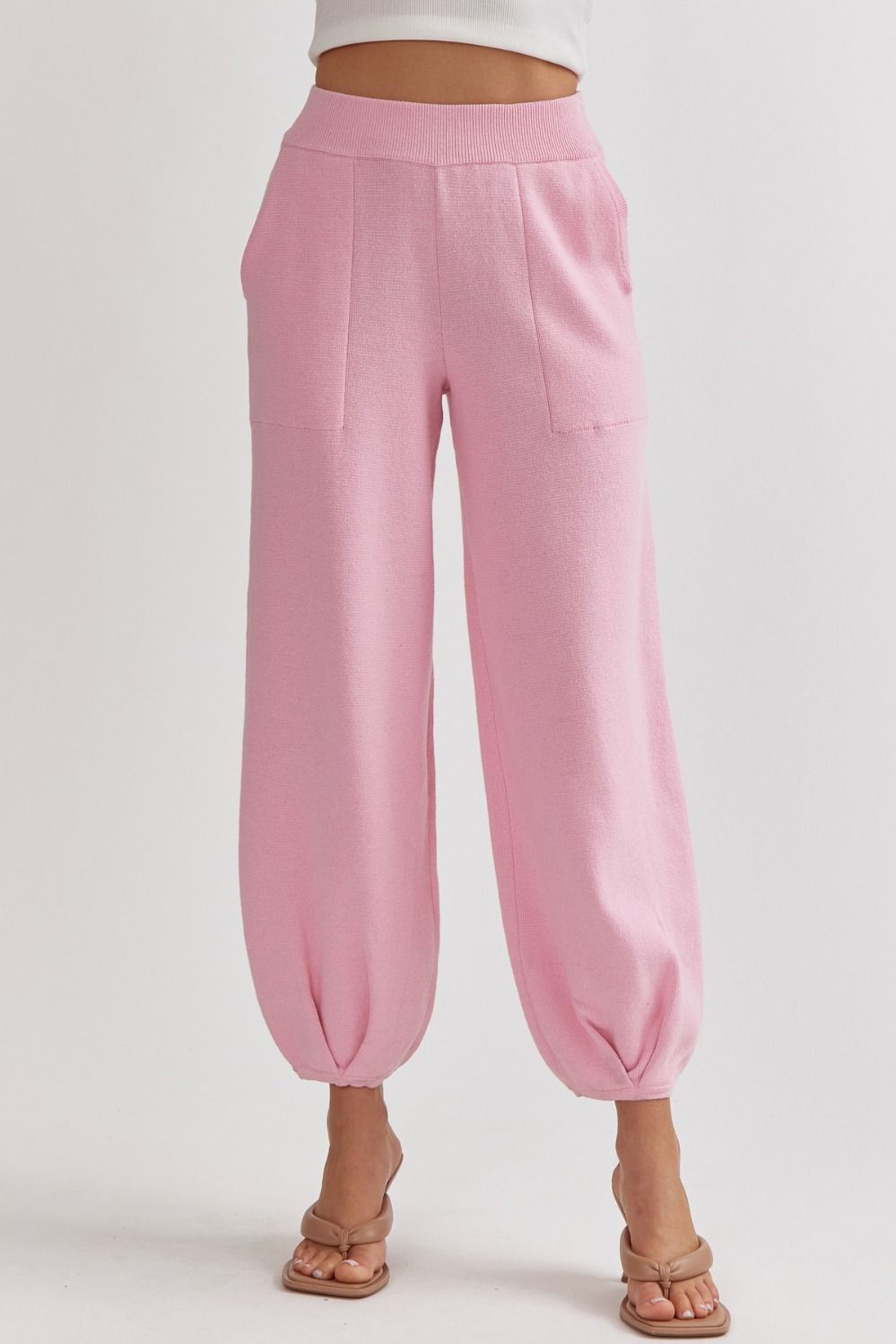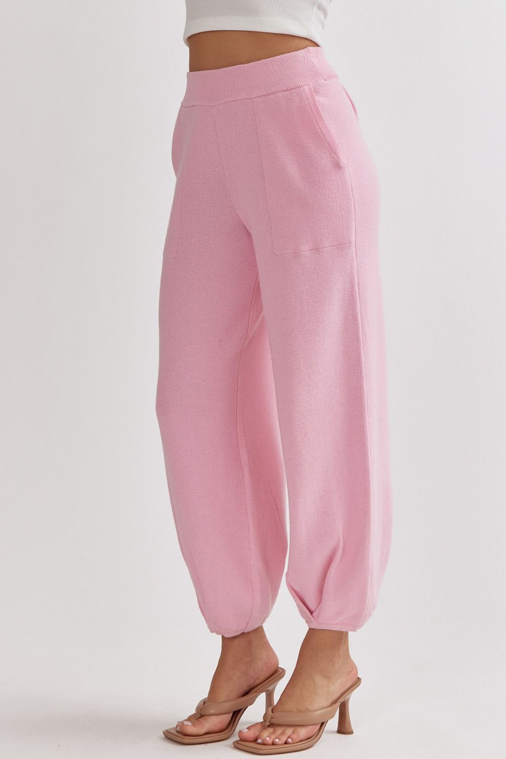 Solid knitted high-waisted joggers featuring elastic waist. Pockets at side. Unlined. Knit. Non-sheer. Lightweight.